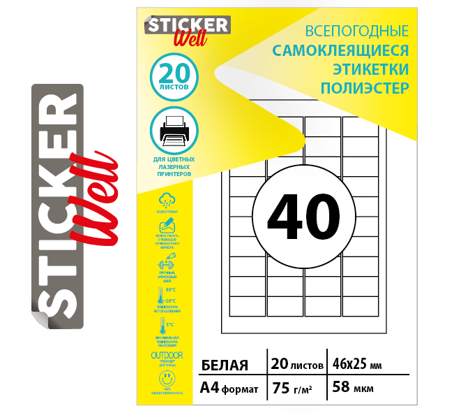 Этикетки на пленке всепогодные, белые, 46х25 мм, 20 листов А4, для ч.б. и цветной лазерной печати полиэстер, самоклеящиеся