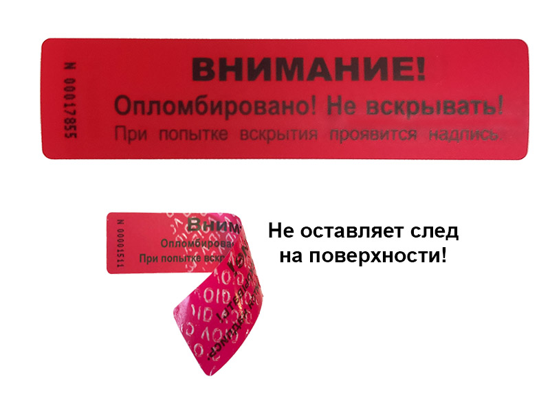 Принцип действия: при отклеивании появляется надпись VOID. При повторном наклеивании надпись не исчезает. НЕ ОСТАВЛЯЕТ СЛЕД НА ПОВЕРХНОСТИ.