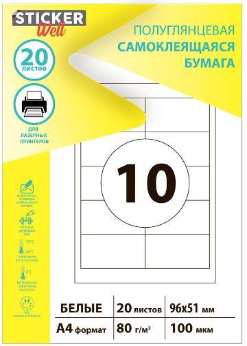 Самоклеящаяся бумага А4, белая, полуглянцевая, 20 листов, 96х51 мм для ч.б. и цветной лазерной печати самоклеящиеся